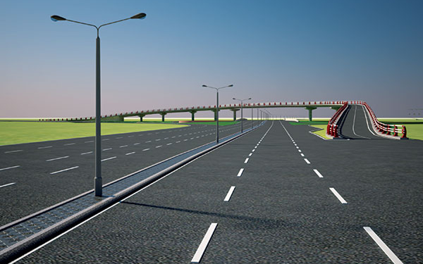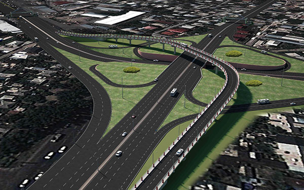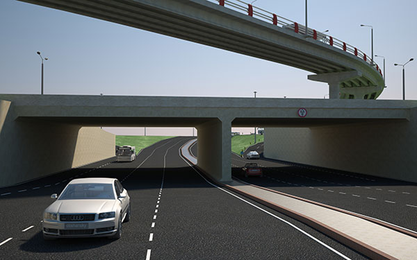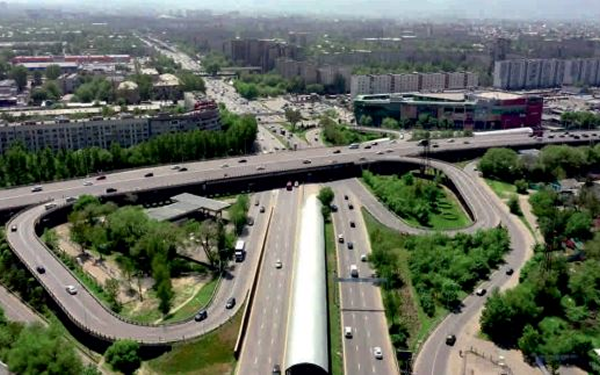 над ул. Саина по эстакаде, лево- и правоповоротных потоков по эстакадным съездам, а лево поворотного потока транспорта с пр. Райымбек на пр. Рыскулова — из. г. Бишкек и юго-западных пригородных районов города в сторону г. Кунаев (г. Капшагай) по путепроводу тоннельного типа, расположенному под пр. Рыскулова с выходом автотранспорта в общий поток, следующий по пр. Рыскулова.